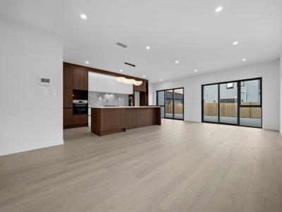 At the heart of the home is a sun-filled open-plan living, dining and kitchen area, where clean lines, quality appliances, and a generous island bench create a welcoming hub for everyday living and entertaining. Large windows and seamless indoor-outdoor flow connect the living space to private decking and a fully fenced backyard, ideal for summer BBQs, children, or pets.