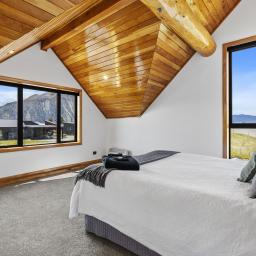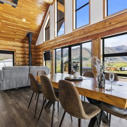 Step inside to an impressive open-plan living area with soaring timber ceilings, a sleek contemporary kitchen, and expansive glazing that frames the sweeping mountain views. Whether it's morning light spilling across the deck or the evening glow settling over the peaks, the vistas here are nothing short of breathtaking.