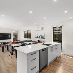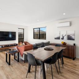 Completed in 2023 by Green Homes, this standalone townhouse delivers exceptional energy efficiency, comfort, and truly low-maintenance living. Thoughtfully designed with sustainability at its core, superior insulation helps reduce energy costs while ensuring a warm, dry, and comfortable home year-round. Bathed in natural light, the open-plan living space is centred around a sleek kitchen featuring engineered stone benchtops and Bosch appliances. A stacker door seamlessly extends the living area to the patio, creating an indoor and outdoor living.