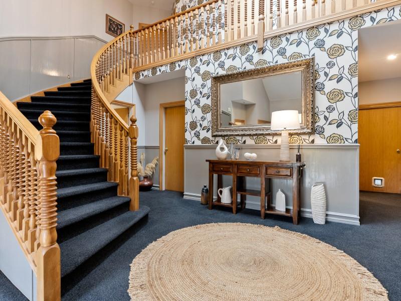 The entrance lobby with its soaring atrium and curved stairway makes its own statement, opening to five bedrooms upstairs - including the generous primary suite with a walk-in wardrobe, private balcony, and expansive ensuite. A study adds flexibility for remote work or extra accommodation, while a family bathroom and separate toilet ensure convenience for busy households. This is a home designed to grow with your family/extended family and stand the test of time.