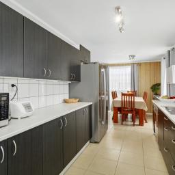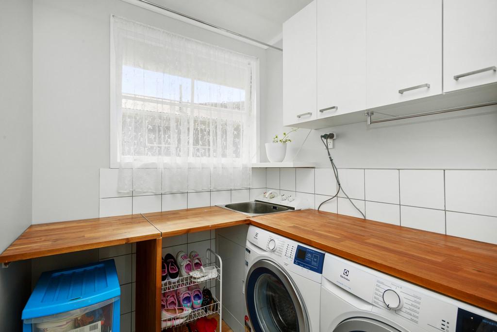 The designated dining space opens to the stylish kitchen with a free standing oven, extractor, dishwasher and ample cabinetry storage. Adjacent, the separate laundry has easy exterior access and comes with convenient bench tops and overhead cabinetry.