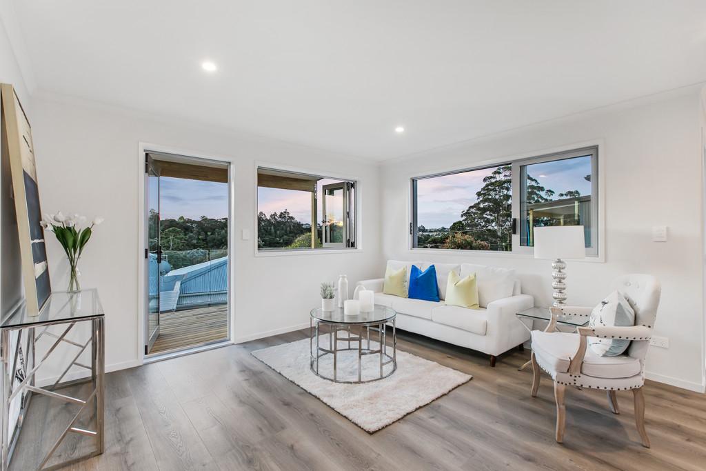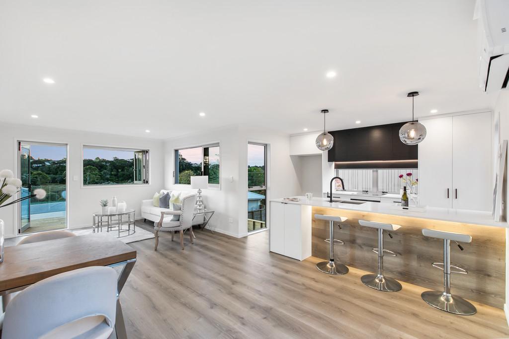 The fresh, light, and elevated interior of the handsome living area, allows for a vantage point out to views of Taipari Strand and is a good balance of easy lock and leave style living and indulgence.