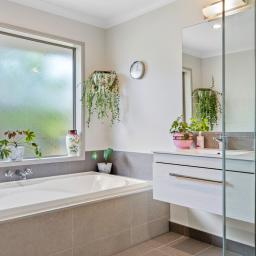 Designed with family living and entertaining in mind, the home offers four generous double bedrooms, including a standout master suite featuring beautiful bay windows, a walk-through wardrobe and a stunning ensuite with a large tiled shower and double vanities. The family bathroom is equally impressive, complete with tiled underfloor heating, a tiled shower and a full bath, plus a separate toilet for convenience.