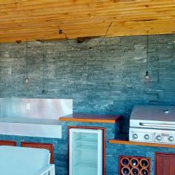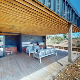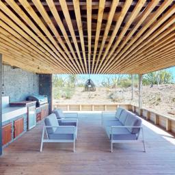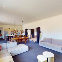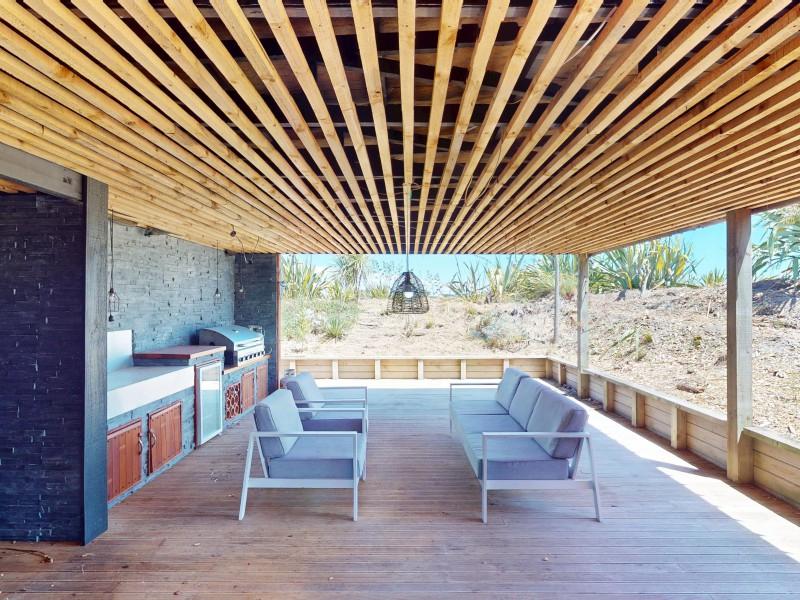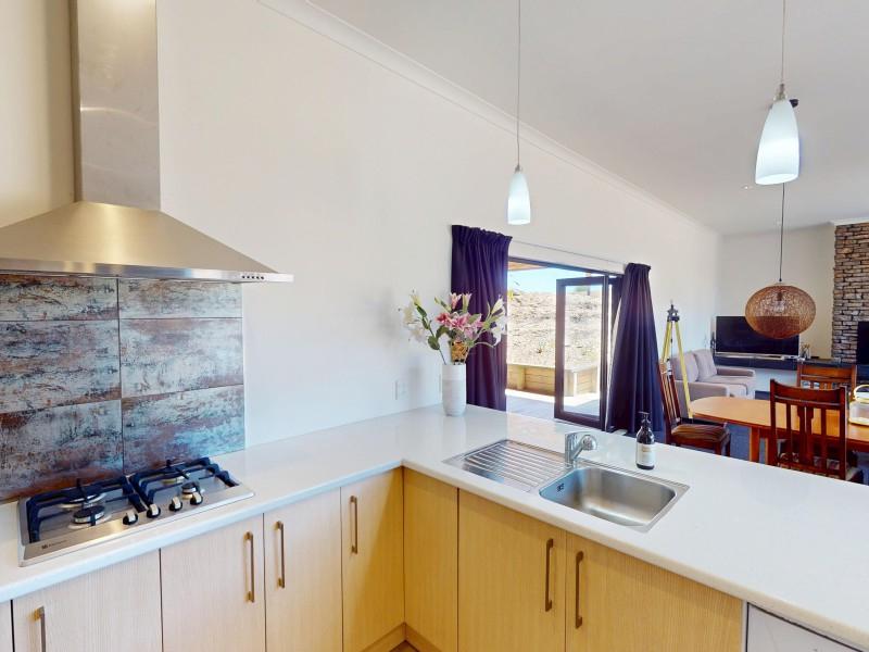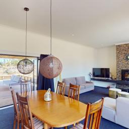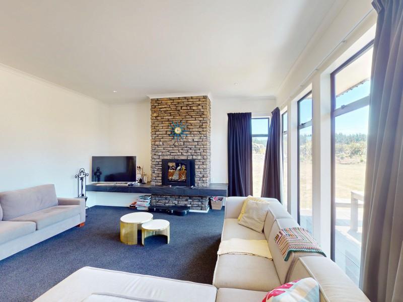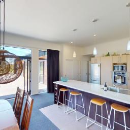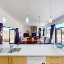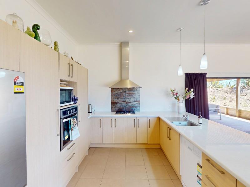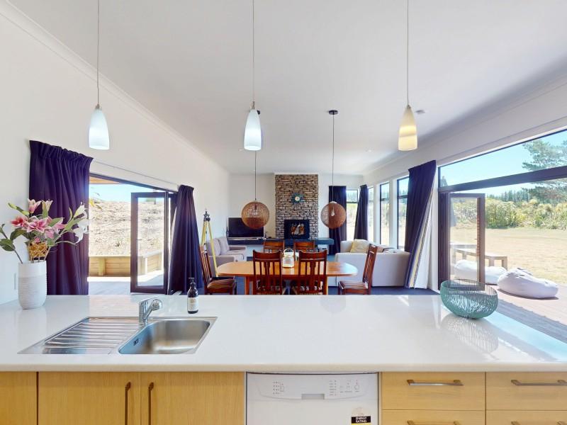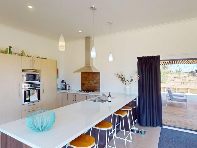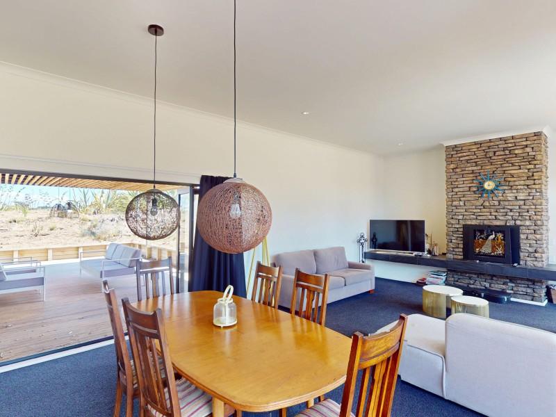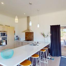 The home is an entertainer’s dream, with an expansive living area, multiple outdoor settings, and seamless indoor–outdoor flow. The main living room features a striking stone-clad chimney and bi-fold doors on both sides, opening to a sheltered alfresco area complete with an outdoor kitchen and spa nook. The modern kitchen includes a large breakfast bar and ample storage, making it ideal for hosting family and friends.