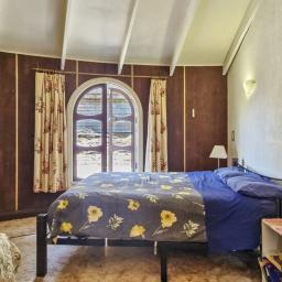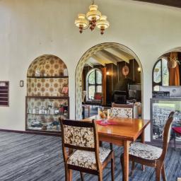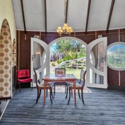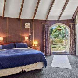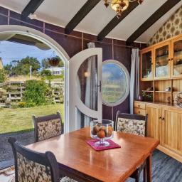 The main living area features soaring, vaulted ceilings and a dome-shaped fireplace. The dining area and those incredible circular "hobbit" doors with custom-crafted circular glass portals lead you straight out to the garden, the perfect spot for your morning coffee while you listen to the distant roar of the Tasman Sea.