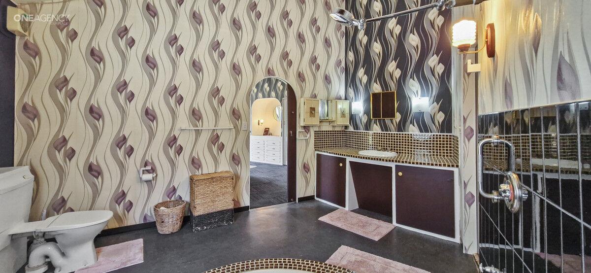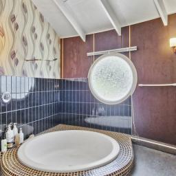 The retro theme continues in the master bedroom that has the arched windows and built-in storage. But the real showstopper? The bathroom. Sink into this incredible circular sunken bathtub and soak away the stress of the day or have a shower under the glow of vintage-style lighting.