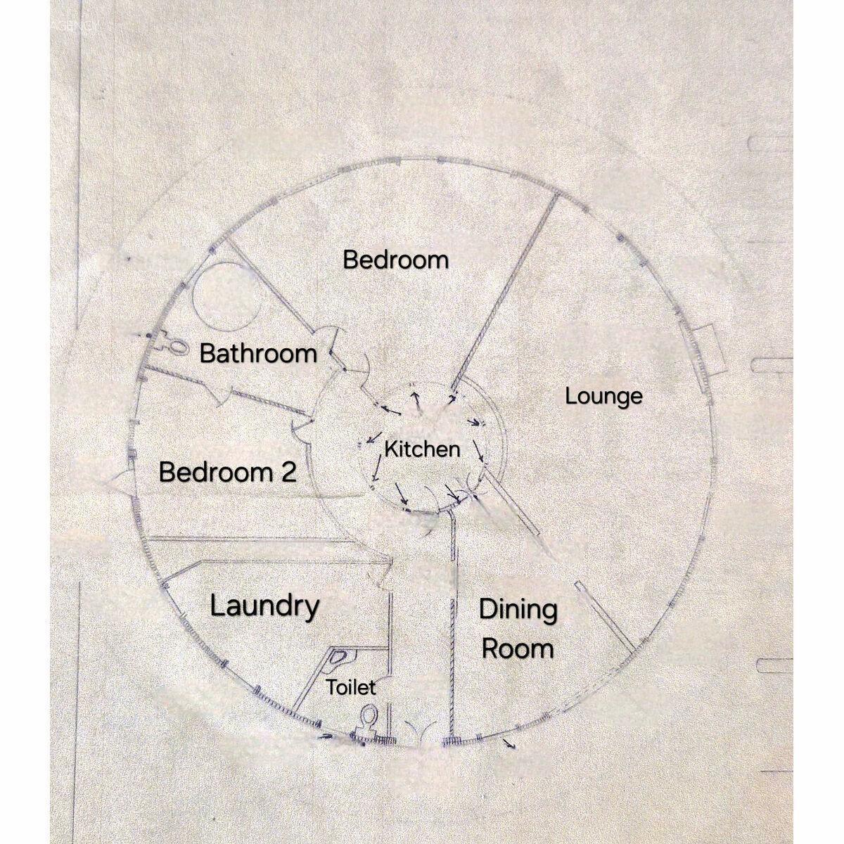 From the moment you arrive, you'll feel like you've stepped onto a movie set. With its circular silhouette, this home captures that magical Hobbit-style charm. The wide, wraparound eaves provide perfect shade, and the central glass pyramid skylight ensures your home is always bathed in natural warmth and light.