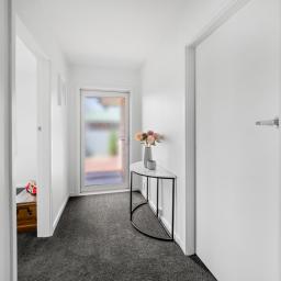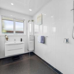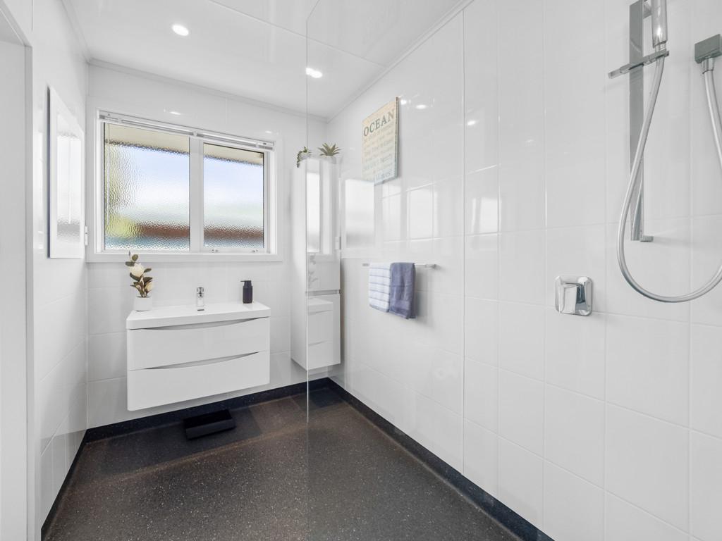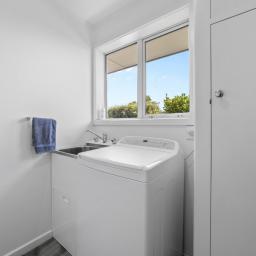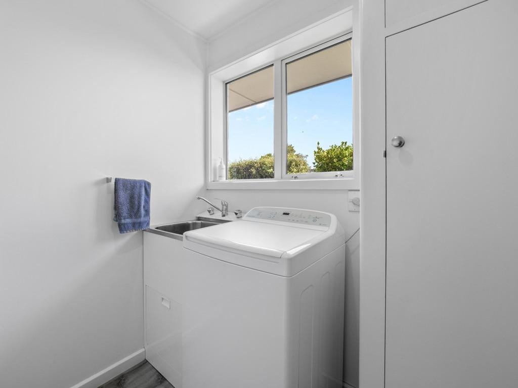 The home features three bedrooms, beginning with the generous master, which includes a wardrobe and an extra built-in nook with drawers, adding a thoughtful touch. Late afternoon sun enhances the comfort of the space. The remaining two bedrooms are ideal sizes for a growing family and both include built-in wardrobes. The expanded bathroom has been thoughtfully designed, featuring an open shower, floating vanity, and cabinet tower, providing space for everybody. The bathroom flows through to a separate toilet, with convenient access to the separate laundry, making busy mornings easy. The laundry offers great access to the back half of the well-maintained property. Nearby is the clothesline, connected by concrete footpaths. Step off the elegant Kwila deck-yes, ANOTHER deck! This one captures the morning sun and offers afternoon shade, making it perfect for year-round refreshments and leisure.