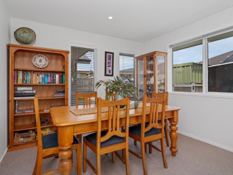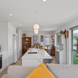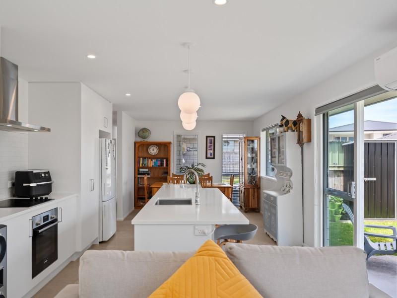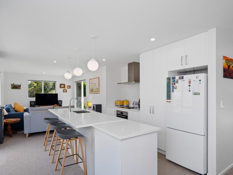 Light-filled open-plan living is centred around a contemporary kitchen with a large island, soft neutral tones and excellent natural light. The cosy living area flows off the kitchen as does the dining space which is comfortably suited to a 6–8 seater table. There is a heat pump for all year comfort.