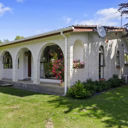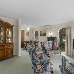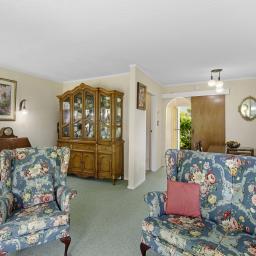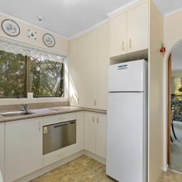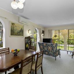 The home features a warm and inviting living and dining area, complemented by a well-appointed kitchen that overlooks beautifully established gardens—designed for year-round colour with thoughtful plantings. A modern bathroom with both a bath and separate shower ensures everyone’s preferences are catered for. Both bedrooms are generously sized and include large wardrobes.