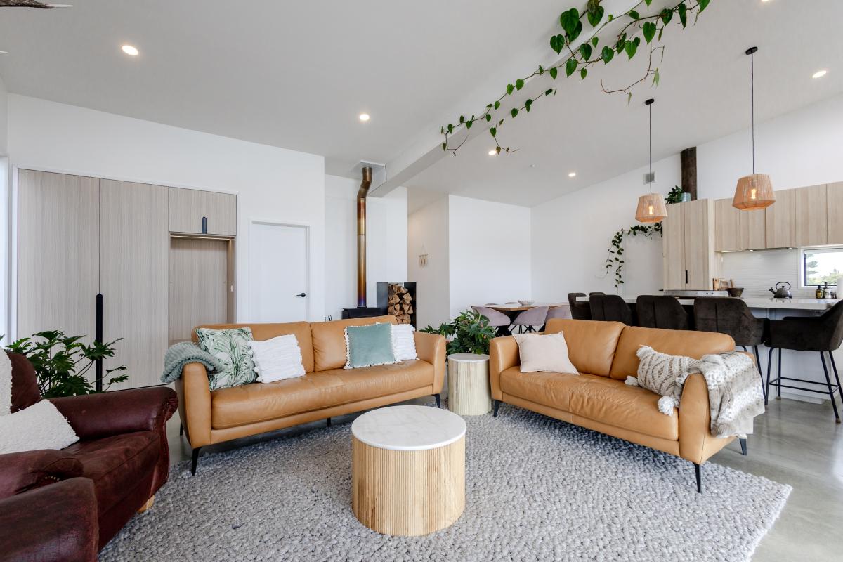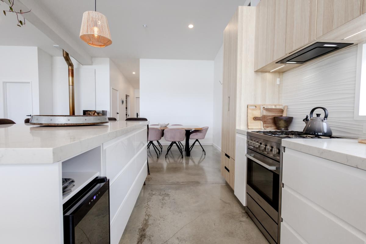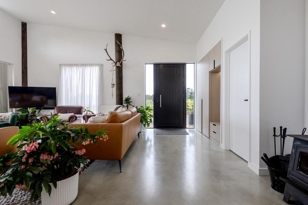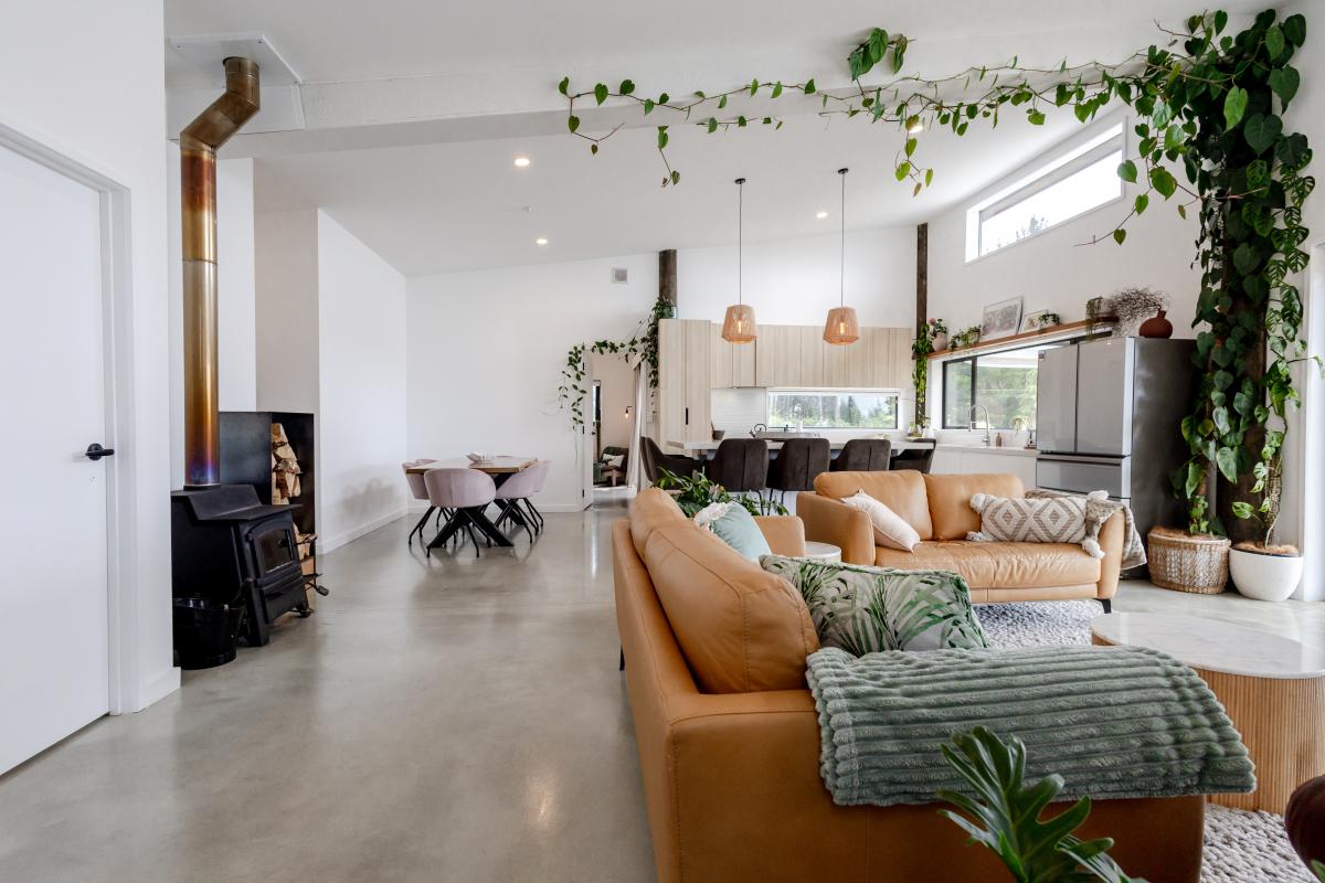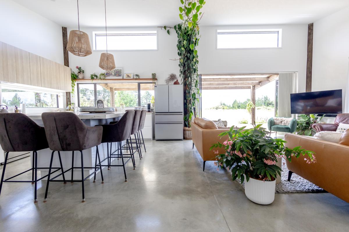 Inside, polished concrete floors and stone benchtops set a calm, refined tone. Light moves through the home from morning to evening and the open-plan kitchen, dining and living area flows naturally onto a fully covered, wrap-around deck, a front-row seat for every season, every colour shift, every pause in the day. The finish throughout is cohesive and beautifully resolved, with a show-home feel that carries from room to room.