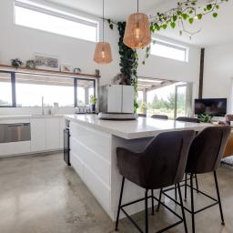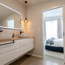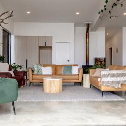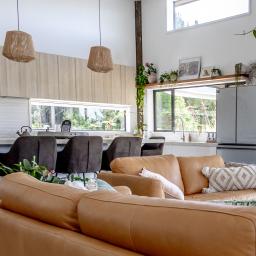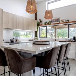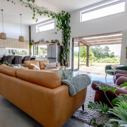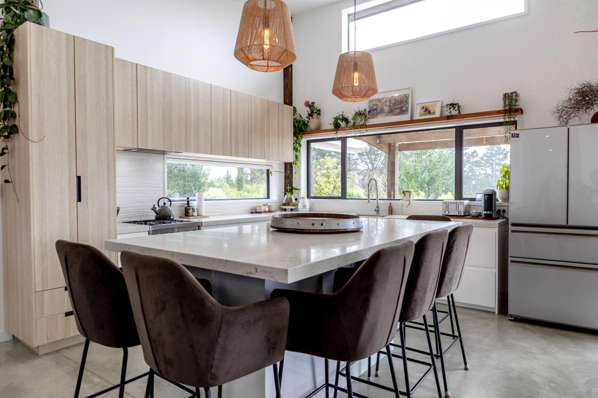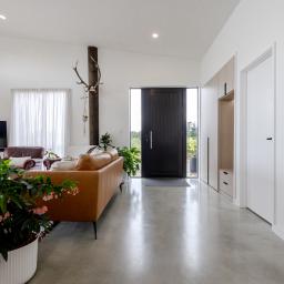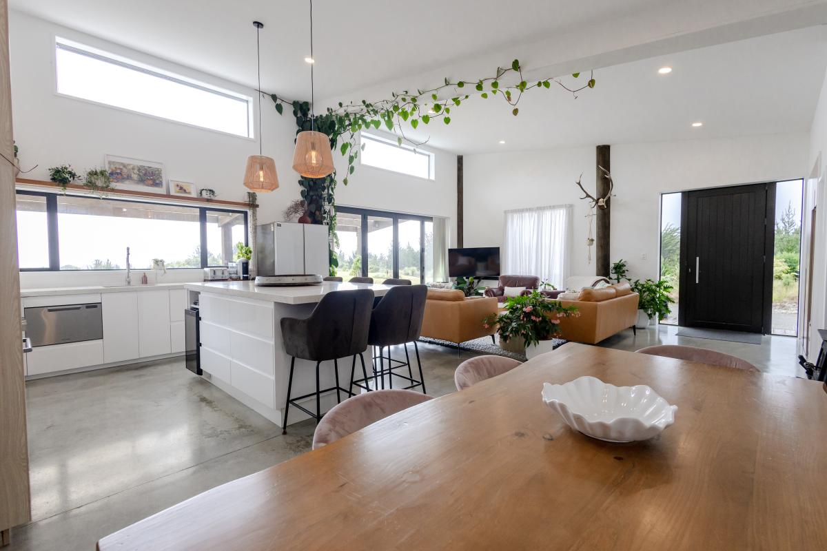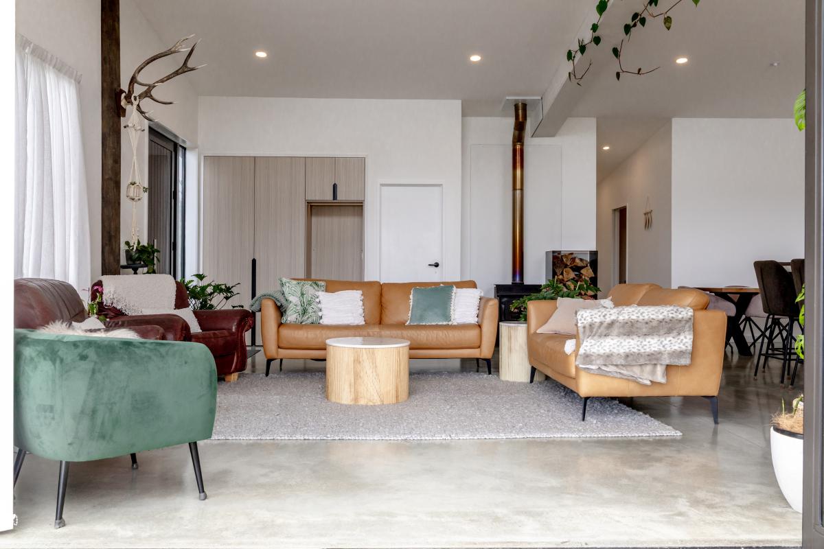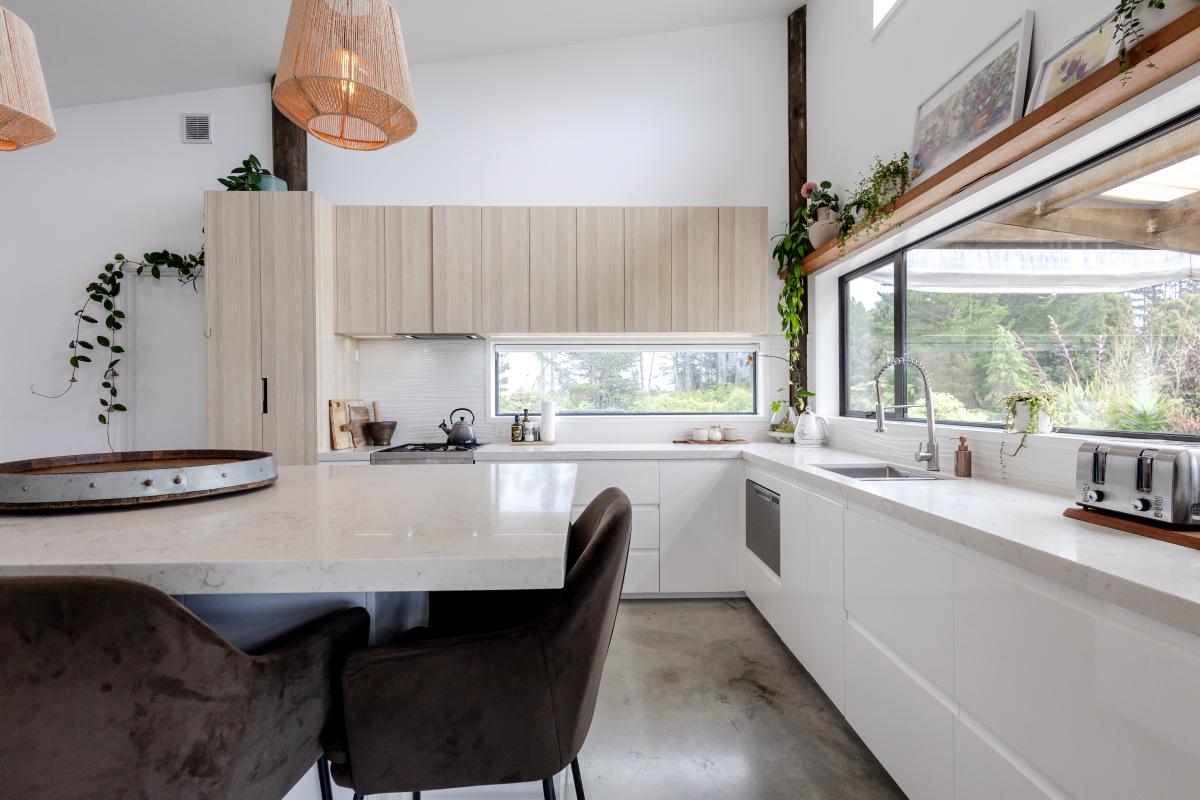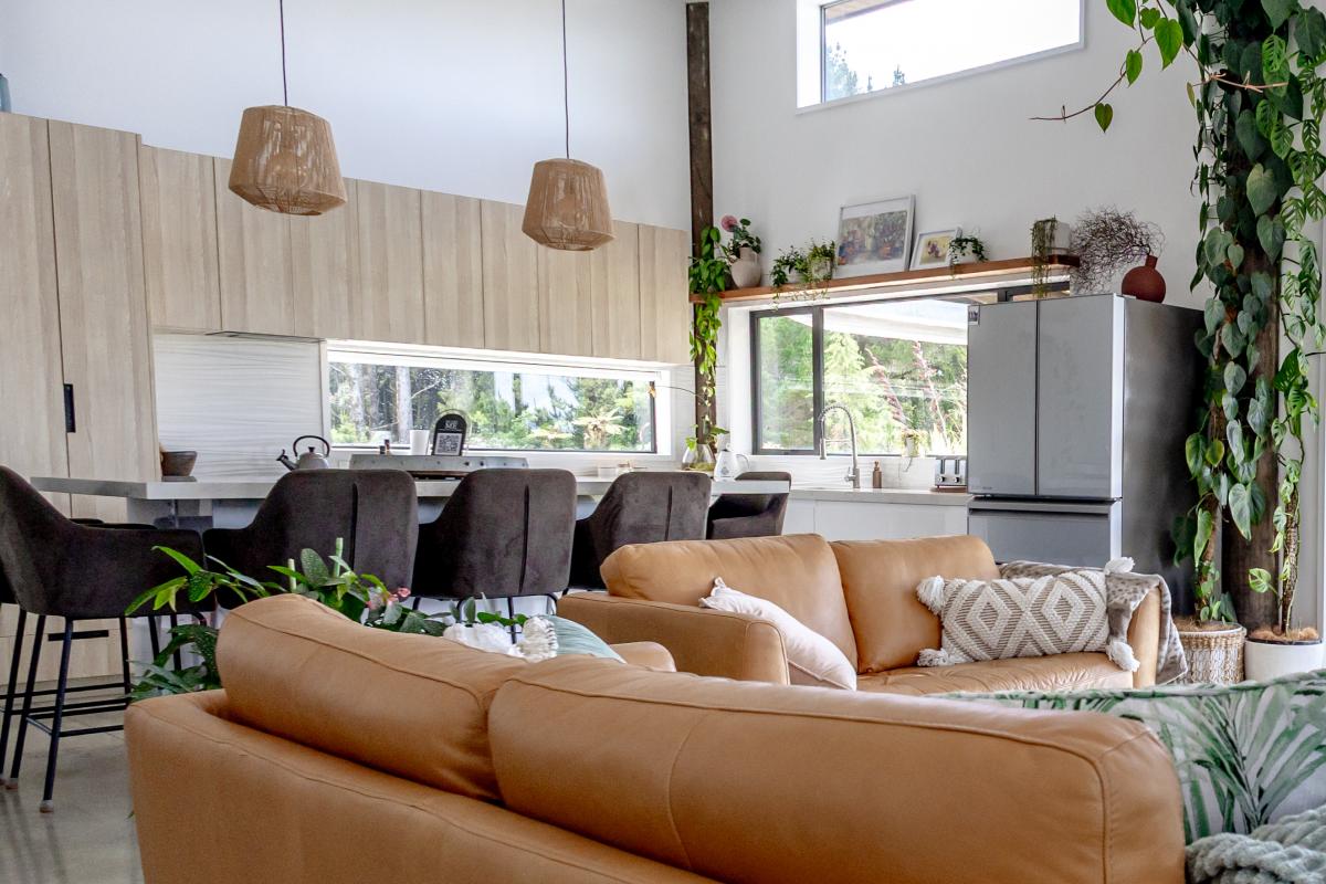 Inside, polished concrete floors and stone benchtops set a calm, refined tone. Light moves through the home from morning to evening and the open-plan kitchen, dining and living area flows naturally onto a fully covered, wrap-around deck, a front-row seat for every season, every colour shift, every pause in the day. The finish throughout is cohesive and beautifully resolved, with a show-home feel that carries from room to room.