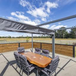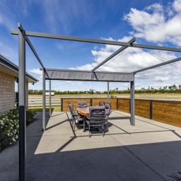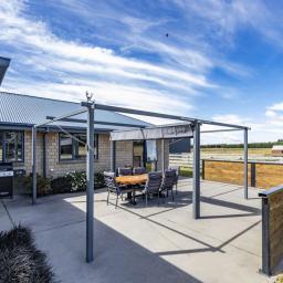 Indoor living flows seamlessly outdoors to an entertainment area featuring a pergola with shade cloth and a purpose-built wind protection wall, creating a private, usable space in all seasons. The landscaped grounds around the home enhance the setting and provide an inviting first impression.