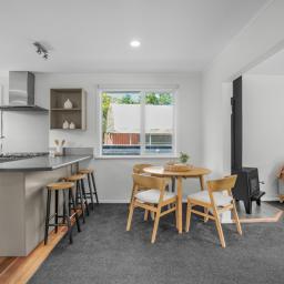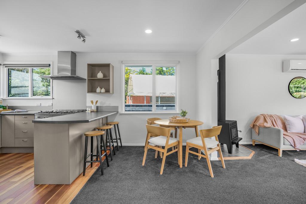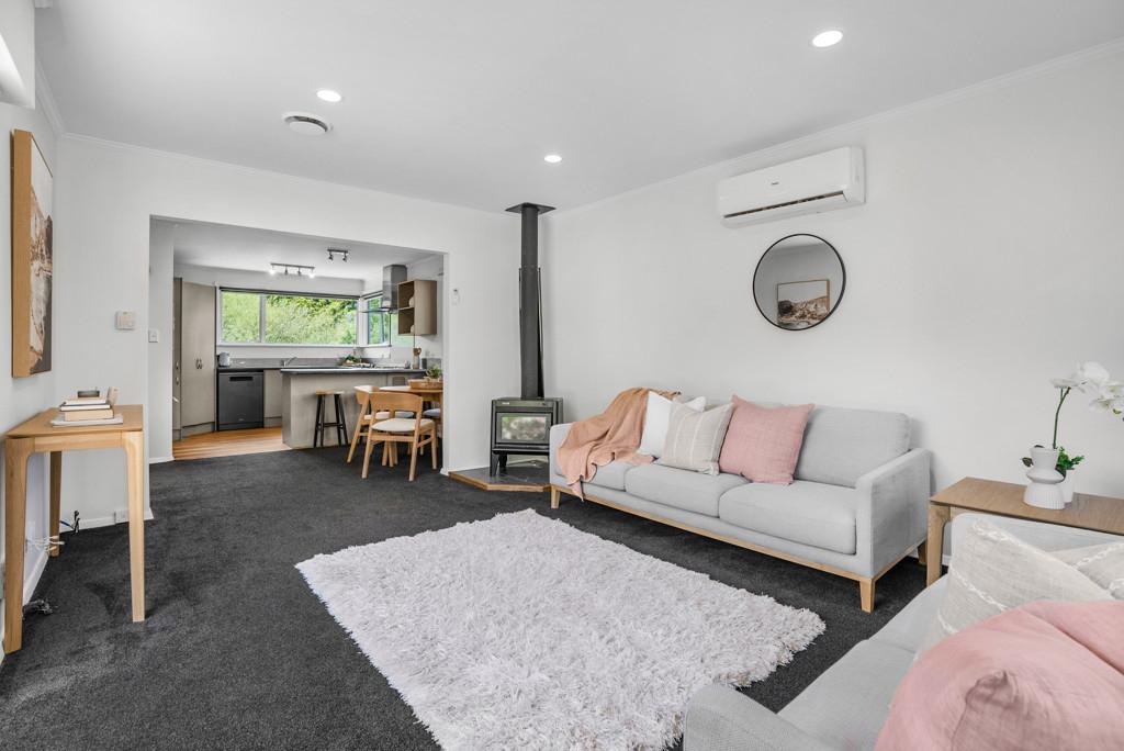 Inside, the living room is warm and welcoming, featuring both a heat pump and wood burner, and flowing seamlessly into the open-plan kitchen and dining area. The kitchen is well appointed with a gas cooktop, rangehood, ample pantry space, and a breakfast bar for everyday convenience. A heat transfer system ensures warmth is shared throughout the home.