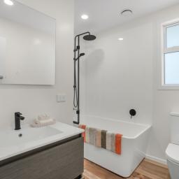 Down the hallway you'll find three cosy bedrooms, each with built-in wardrobes, serviced by a renovated family bathroom. Finished with sleek black fixtures, the bathroom includes a shower over bath, vanity, toilet, extractor fan, and heated towel rail.