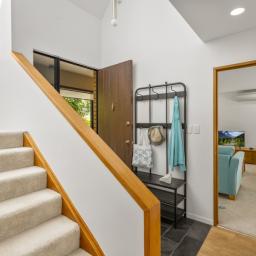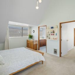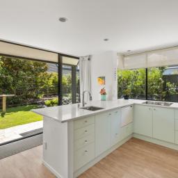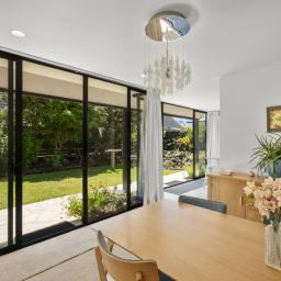 Inside, the recognised design expertise is immediately apparent. Floor-to-ceiling windows along the northern side flood the home with natural light, enhancing the flow and showcasing a well-considered layout that feels both practical and warmly inviting. The open-plan living connects seamlessly to the outdoors, while three generous bedrooms — including a master with its own bathroom — offer comfort and flexibility for family or guests.