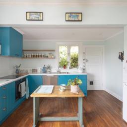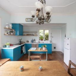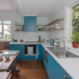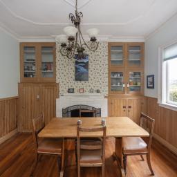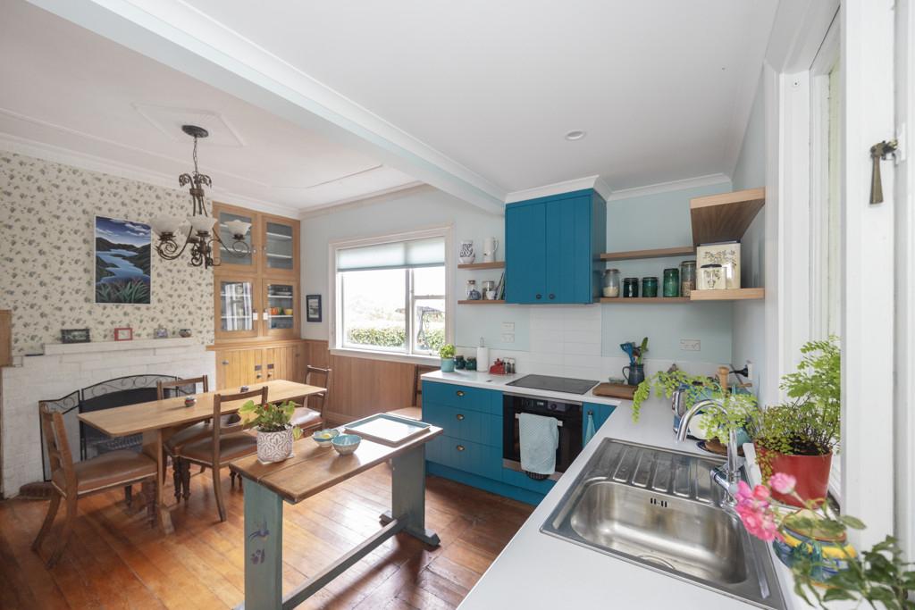 The kitchen balances original character and modern convenience. Timber floors, cupboards, wallpaper, and an open fire retain the home's charm, while a contemporary stove, cooktop, extractor fan, and dishwasher provide practical, up-to-date functionality. Thoughtfully added timber shelving complements the original elements, blending old and new seamlessly.