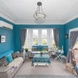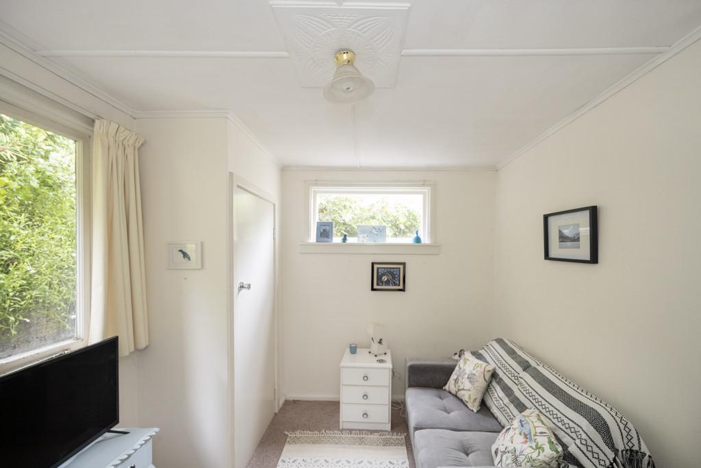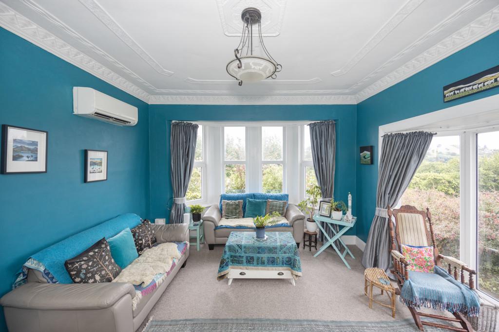 Thoughtfully modified over the years, the home feels bright, practical, and full of character. The separate lounge features a cosy open fire set in red brick, complemented by blue décor and lighting that draws the eye to the tall ceilings with elegant detailing. With double glazing and a heat pump, the room is comfortable year-round, while large sliding doors open onto the deck, a perfect place that invites peaceful sunrise moments in your private retreat.