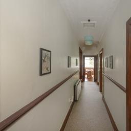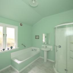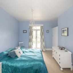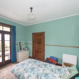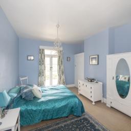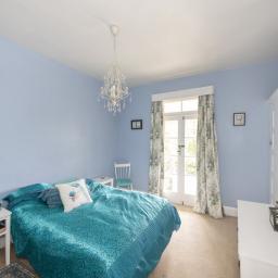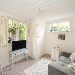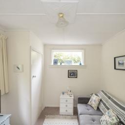 The master bedroom is generous, with soft blue tones and natural light flowing through French doors that open onto the deck. Ample storage and elegant details, including a feature chandelier and charming wardrobe, complete the space. The second bedroom has an open fire, French doors, and space for freestanding storage, creating a warm, inviting atmosphere. The third bedroom is ideal as a home office or single bedroom, with built-in storage, natural light, and green outlooks that make it a quiet, comfortable space.