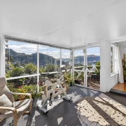 Originally built in the 1960s and extended with a full upper level, the home now offers excellent flexibility. With five spacious bedrooms, or four bedrooms plus a second living or work-from-home space, it is ideal for growing families. Two upstairs bedrooms feature exposed beams and sweeping views across the harbour and surrounding hills, creating peaceful, light-filled retreats.