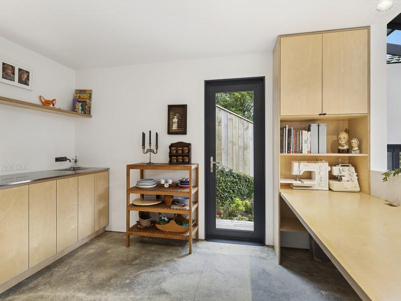 - Adaptable den or mini-studio with built in desk and even a sinkbench for the ultimate in multipurpose utility space
