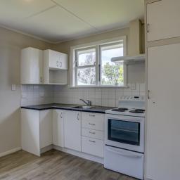 - The tidy kitchen boasts plenty of storage, making meal preparation a breeze.