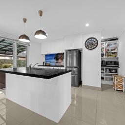 The home features 3 generously sized bedrooms, 2 bathrooms, and 2 living areas, complemented by a double garage and a practical 179 sqm floor plan designed for easy everyday living. A functional kitchen with scullery connects seamlessly to dining area and the main living spaces, while blinds and curtains throughout enhance comfort and privacy.