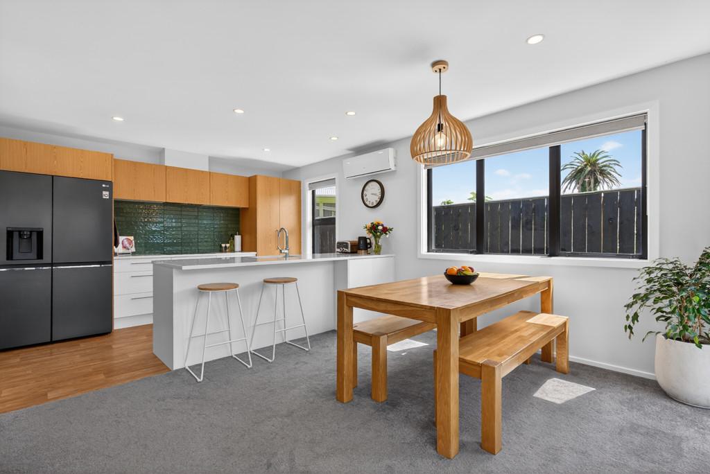 The ground floor is the heart of the home, showcasing an open plan kitchen, dining and living area that blends comfort and sophistication. The kitchen is beautifully appointed, while the dining and lounge flow seamlessly through sliding doors to a private patio, perfect for entertaining family and friends year round. A separate study sits conveniently downstairs alongside a guest toilet, offering ideal functionality for hosting. This level also includes a single internal access garage, additional storage, a heat pump and thoughtfully designed spaces for everyday ease.