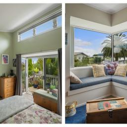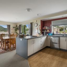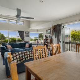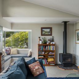 Double glazing keeps the home comfortable year-round, while the open-plan kitchen, dining & living flows out to a lovely cobbled outdoor entertaining area. The dining space opens to a balcony - perfect for morning coffee - and a window seat in the lounge invites cozy moments. A fireplace adds warmth and ambiance in winter. Thoughtful design ensures river, range, and sea views can be enjoyed from multiple points, with stunning sunsets to match.