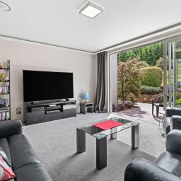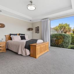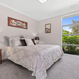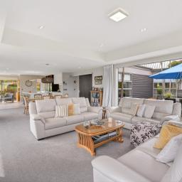 The main bedroom suite, located at the front of the home, opens onto the immaculate lawn and features a large walk-in wardrobe and a spacious, well-appointed ensuite. Two further generous bedrooms are serviced by the main bathroom with a freestanding bath, while the guest bedroom suite at the rear of the home enjoys its own walk-in wardrobe and ensuite. Opening via ranch sliders to a private decked area, this space is ideal for a dependent family member or potential income from paying guests.
