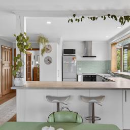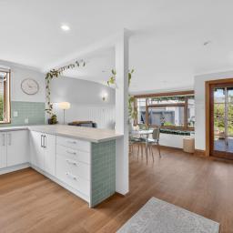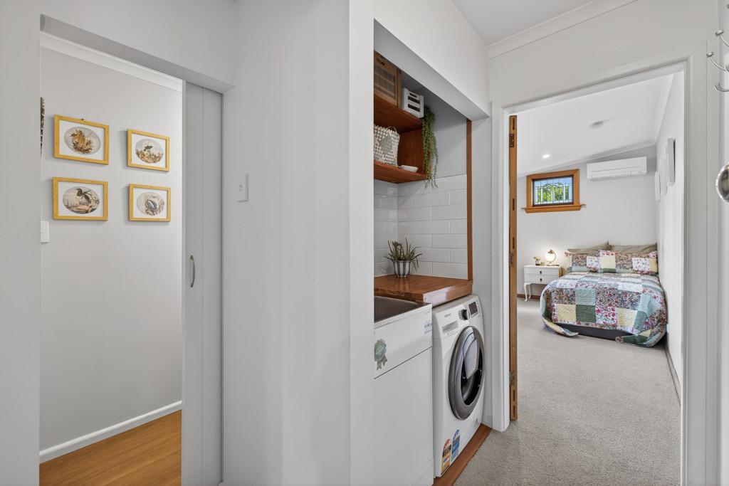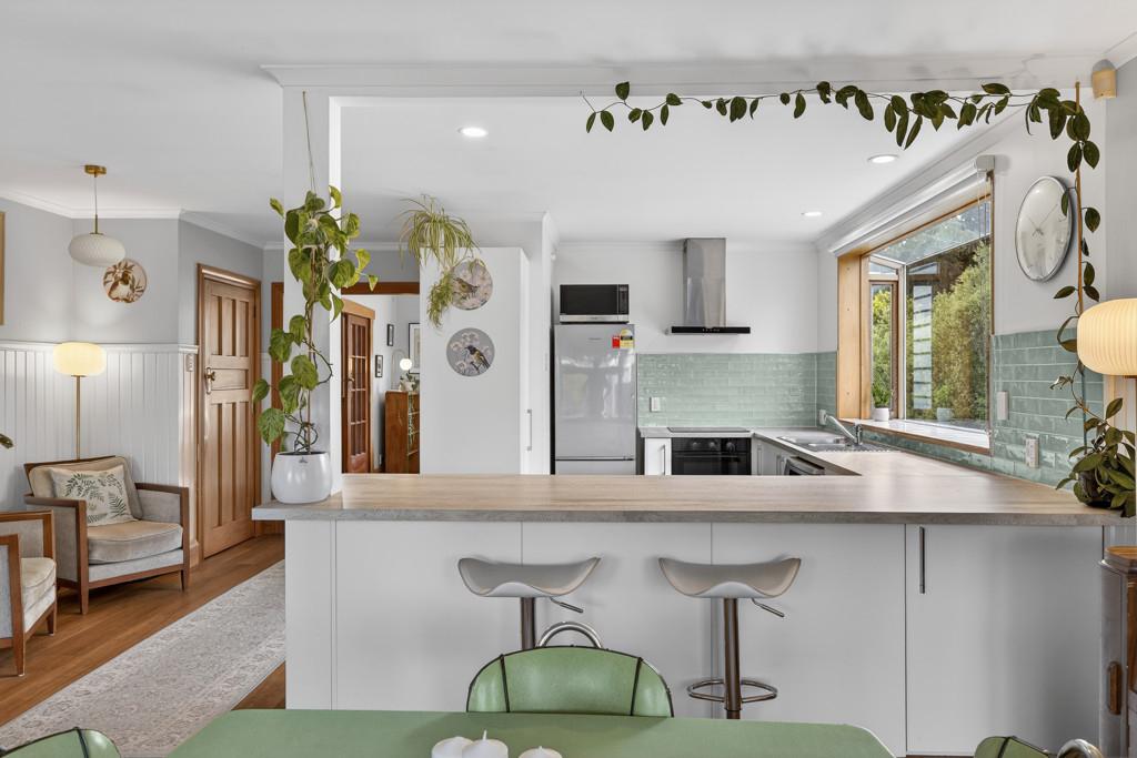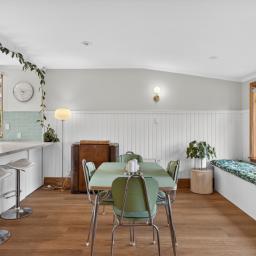 The open-plan kitchen and dining area creates an easy flow for family life and entertaining, while the spacious living area is warm and welcoming year-round, enhanced by a wood fire and supported by four heat pumps located throughout the home to ensure comfort in every season. A well-appointed family bathroom and a dedicated laundry space further enhance the home's practicality and functionality.