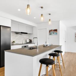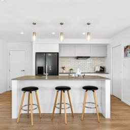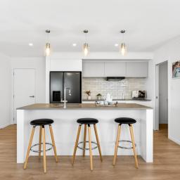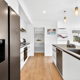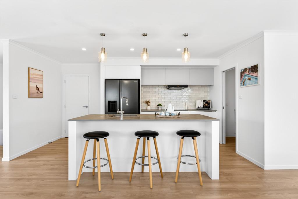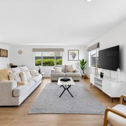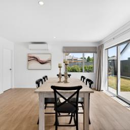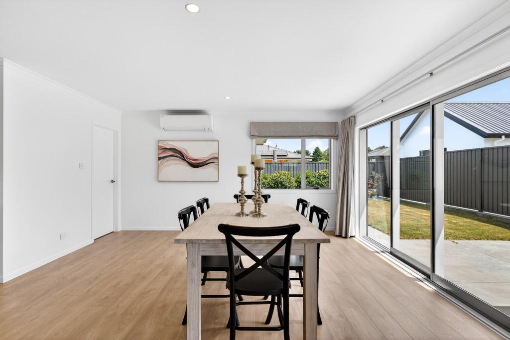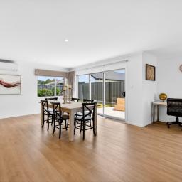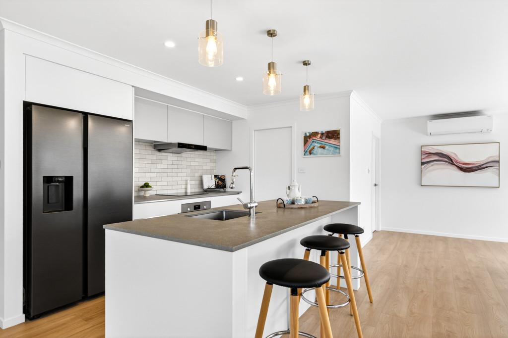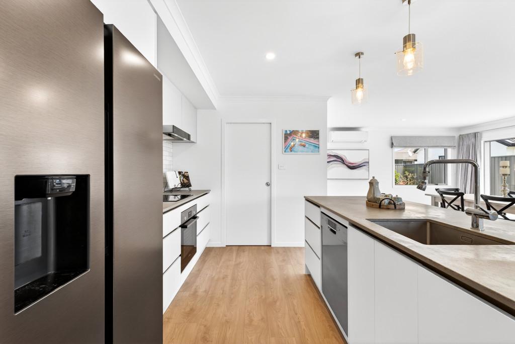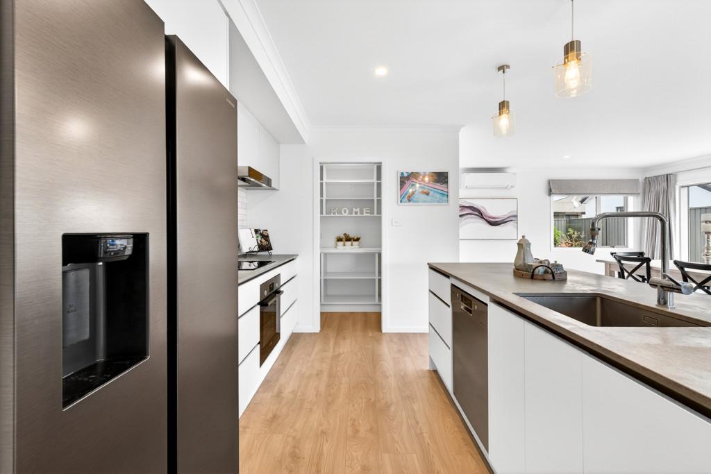 At the heart of the home is the open-plan kitchen - a true family hub. Featuring a sleek island bench with breakfast bar, walk-in pantry, Bosch appliances, tiled splashback, and plenty of space for a double fridge, it flows seamlessly into the living and dining area. A heat pump keeps the space comfortable year-round, while the HRV system ensures fresh, ventilated air. Large sliding doors open to a private, sun-drenched courtyard, perfect for family gatherings or for children and pets to play safely.