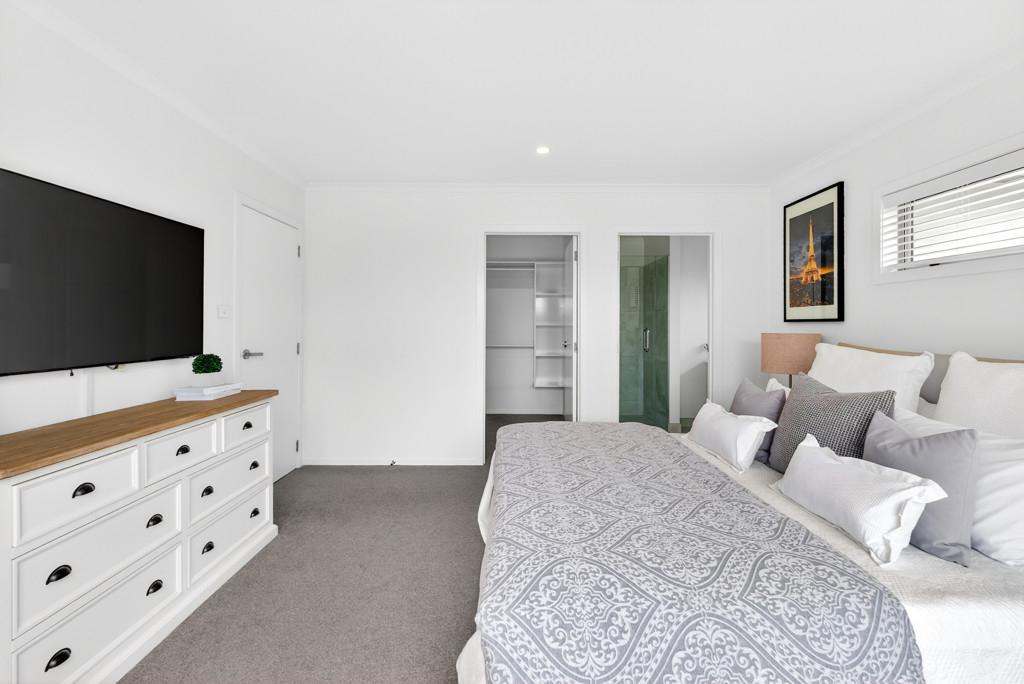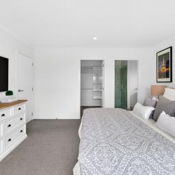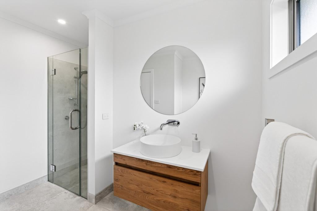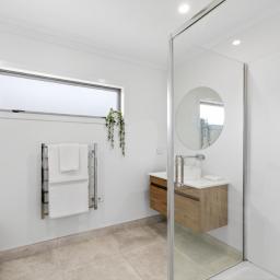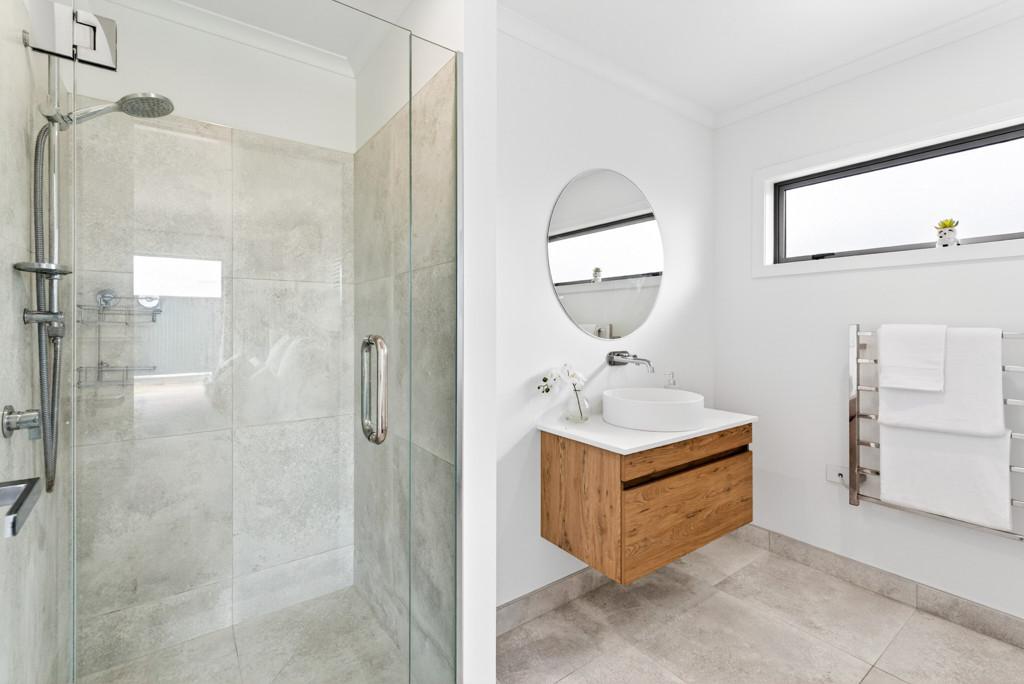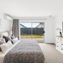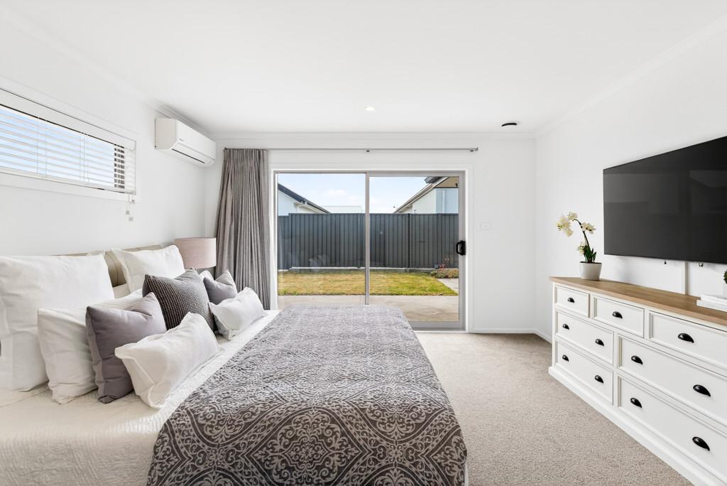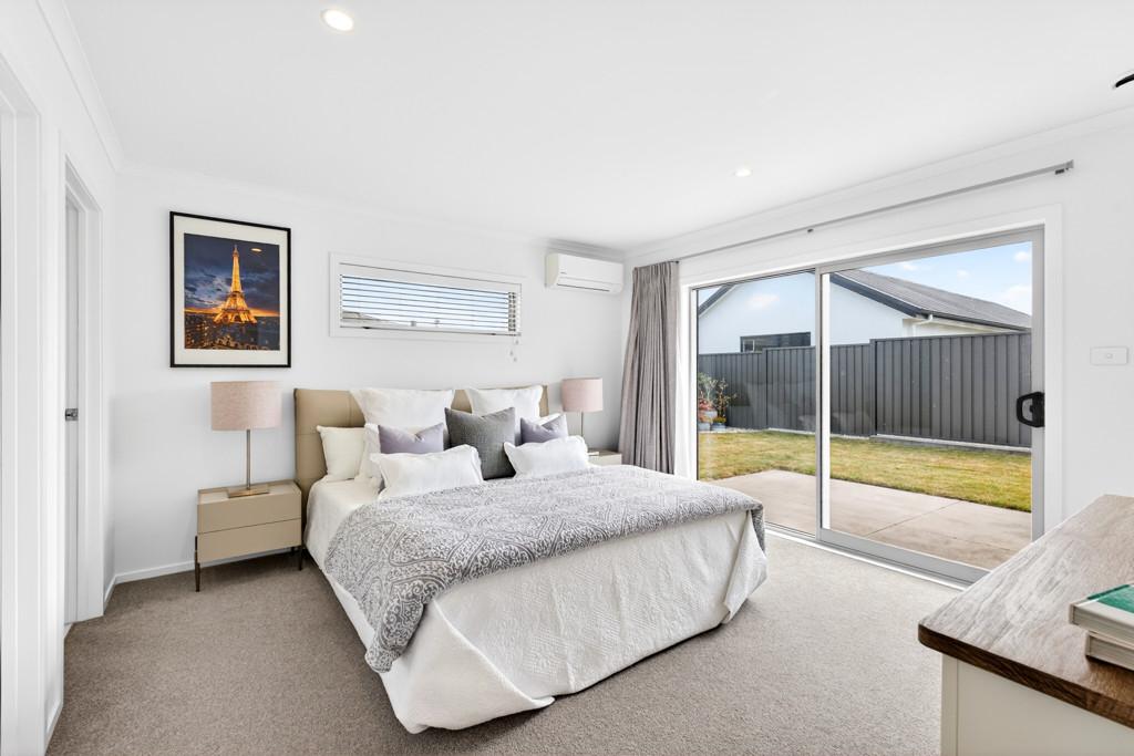 The master bedroom is a peaceful retreat with patio access, walk-in wardrobe, and heat pump for year-round comfort, complemented by a stylish ensuite with tiled shower and heated towel rails. Two additional bedrooms are generously sized with double wardrobes, ideal for children or flexible living spaces.