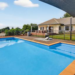 Accommodation includes three bedrooms plus a nursery or sunroom, complemented by beautifully restored native timber floors, a fire and heat pumps, creating a warm and inviting character home. A generous modern open-plan kitchen, dining and living area forms the heart of the property. French doors open to a large, sheltered outdoor entertaining space overlooking the saltwater swimming pool, astroturf tennis court, kiddie play area with sandpit and Treadlite horse arena – perfect for relaxed entertaining or active family living.
