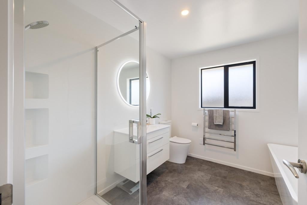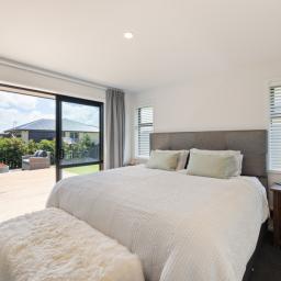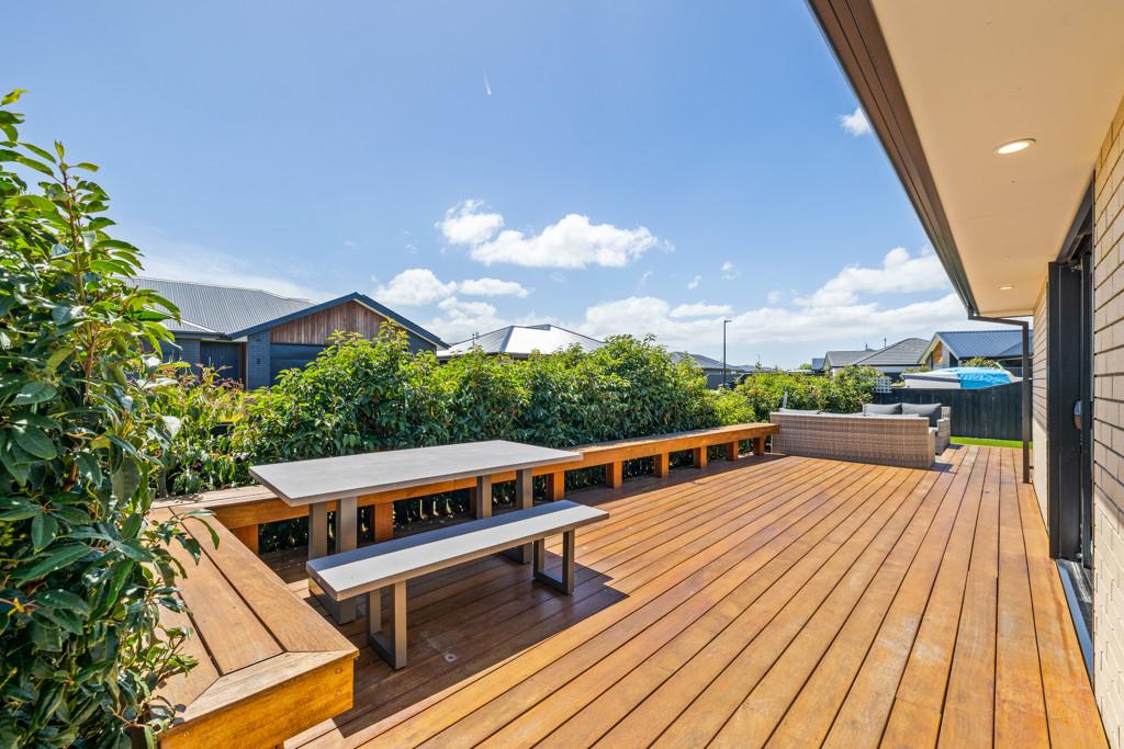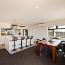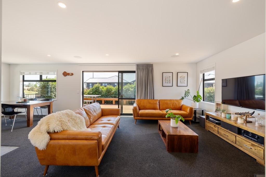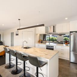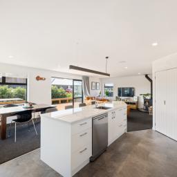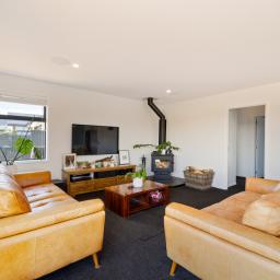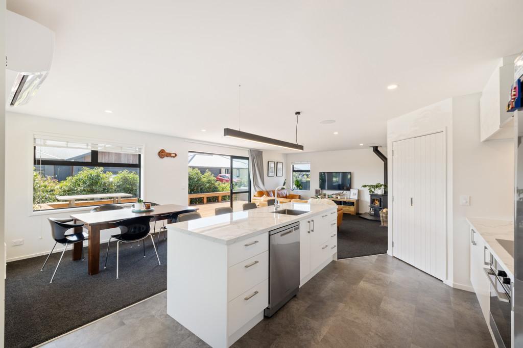 The heart of the home is the spacious open-plan living, dining, and kitchen area, designed for everyday ease and effortless entertaining. The modern kitchen, with an island bench and space for a plumbed double fridge, is complemented by a walk-in pantry with sensor lighting, while seamless indoor-outdoor flow connects the living space to a large wraparound deck. A log burner and heat pump ensure year-round comfort, making this home warm and inviting in every season.