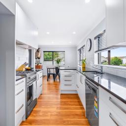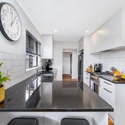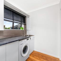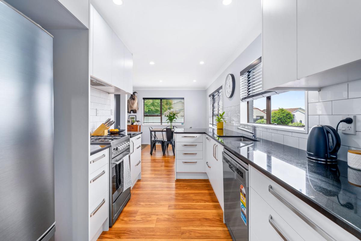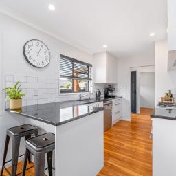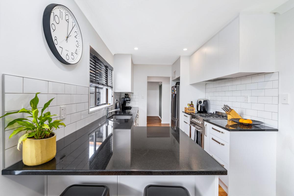 The home centres around a modern kitchen with a stone benchtop, positioned for easy everyday living and entertaining. Storage is well catered for throughout, and a separate laundry adds to the home’s functionality.