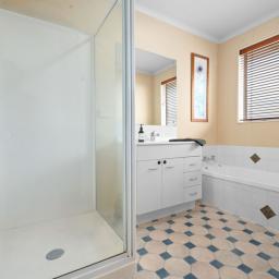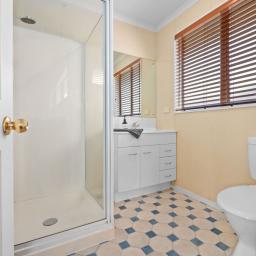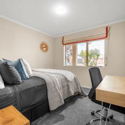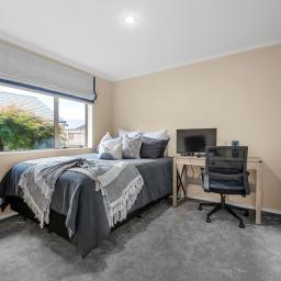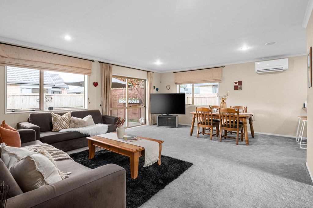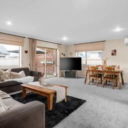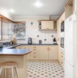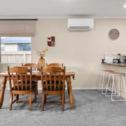The open-plan living and dining area is calm and welcoming, enhanced by air conditioning for year-round comfort and a smooth connection to a sunny outdoor space. It is a home designed for everyday living, with just enough separation and flow to feel both open and settled. The kitchen is neatly positioned at the heart of the home, offering practical bench space, ample storage, and a layout that remains connected to the living zone without dominating it.