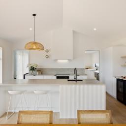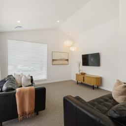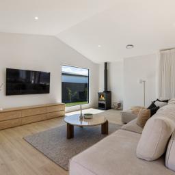 The heart of the home is the open-plan kitchen and living area, where scissor truss ceilings and abundant natural light create a true sense of space. Large sliding doors provide seamless indoor-outdoor flow to two separate decks, making entertaining effortless and offering multiple spaces to relax and unwind. The kitchen is both beautiful and practical, featuring stone benchtops, dish drawers, and standout Robert Gordon feature lighting. A generous galley-style walk-in pantry elevates the functionality of the kitchen, complete with a double-door plumbed fridge, its own sink, and a second oven ideal for hosting or busy family life. The log burner brings coziness to the living area, while ducted heating throughout the home ensures easy, all-season living. The separate lounge, also featuring scissor truss ceilings, provides a comfortable second living space perfect for relaxing, watching TV, or unwinding at the end of the day.