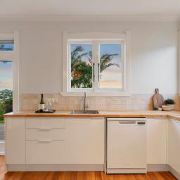 There's an effortless rhythm to the layout, drawing you naturally toward the light-filled kitchen and the yard beyond. The modern kitchen, featuring sleek white cabinetry and warm timber benchtops, flows naturally into the dining area where wide French doors swing open to the outdoors. You'll find an expansive, split-level rear deck - the perfect elevated spot for summer BBQs or evening drinks while overlooking the lush green lawn and the sprawling urban landscape beyond.