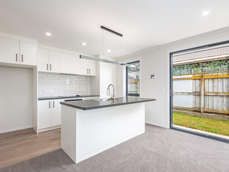 The living area has been designed for relaxed, contemporary living. At one end sits the sleek black-and-white kitchen, flowing seamlessly into the open-plan living space. On a warm summer’s day, throw open one of the two sliders and step out to the sheltered, private courtyard—a perfect spot to gather friends or family for a BBQ.
