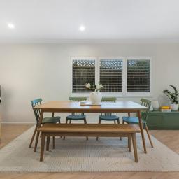 Set back from the road, privacy is immediate. Inside, the open-plan living spaces unfold with ease, connecting naturally to a secluded L-shaped outdoor setting that captures light throughout the day. The relationship between indoors and out feels deliberate and effortless.