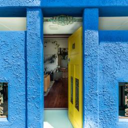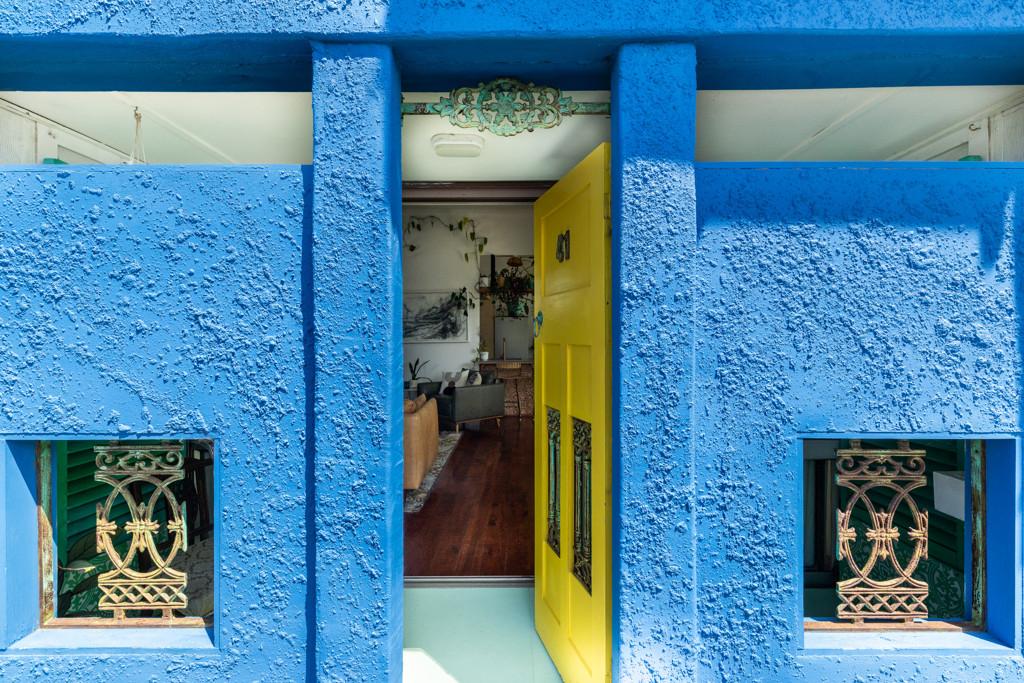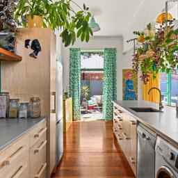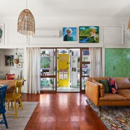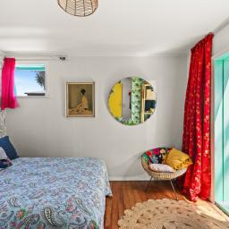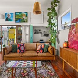Inside, an electric mix of colour and curated furnishings adorn the interior, while elevated ceilings amplify the sense of space and light. The ground floor serves as the heart of the home, featuring a bright, airy open-plan living area and a stylish kitchen equipped with sleek appliances and a large stone benchtop. This level also includes two comfortable bedrooms serviced by a centrally located family bathroom.