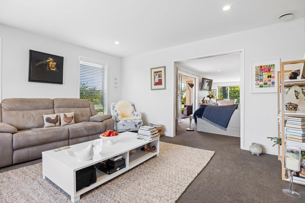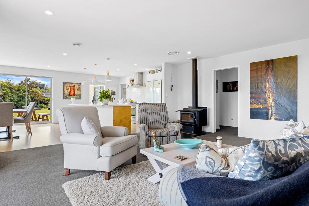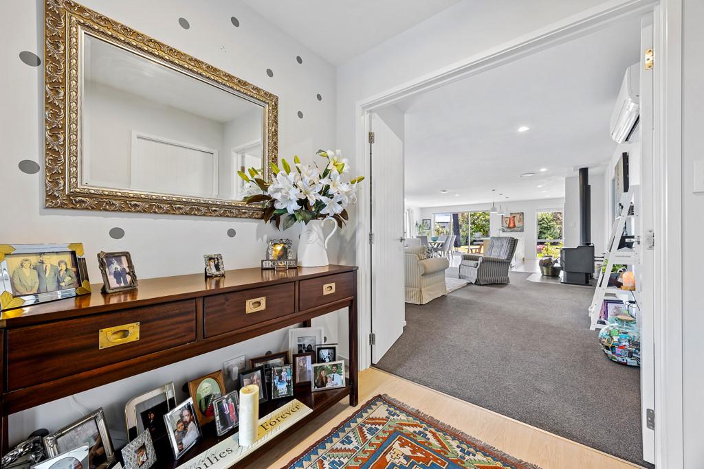 The master suite features a walk-in robe and tiled ensuite, while three further double bedrooms are complemented by a family bathroom and a separate toilet. Multiple heating options including a log fire on wetback, a heat pump and HRV system ensure comfort regardless of the season. Hallway storage helps keep clutter at bay, complemented by a separate laundry for added practicality.
