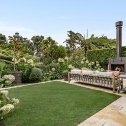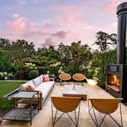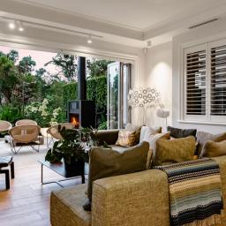 The open-plan dining and informal living zone is framed by an architectural tray ceiling, setting a tone of relaxed elegance. An adjoining snug media lounge with gas fireplace provides a secondary retreat. Stacker doors open to a fully fenced, landscaped garden overlooking Newmarket Park - a serene, leafy outlook that feels immersed in nature. Sun-soaked and private, this outdoor space becomes a natural extension of the interior.