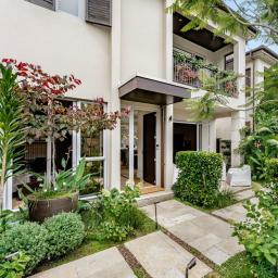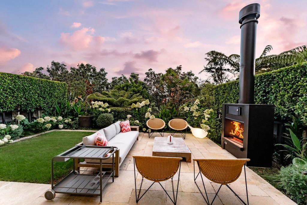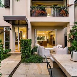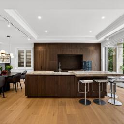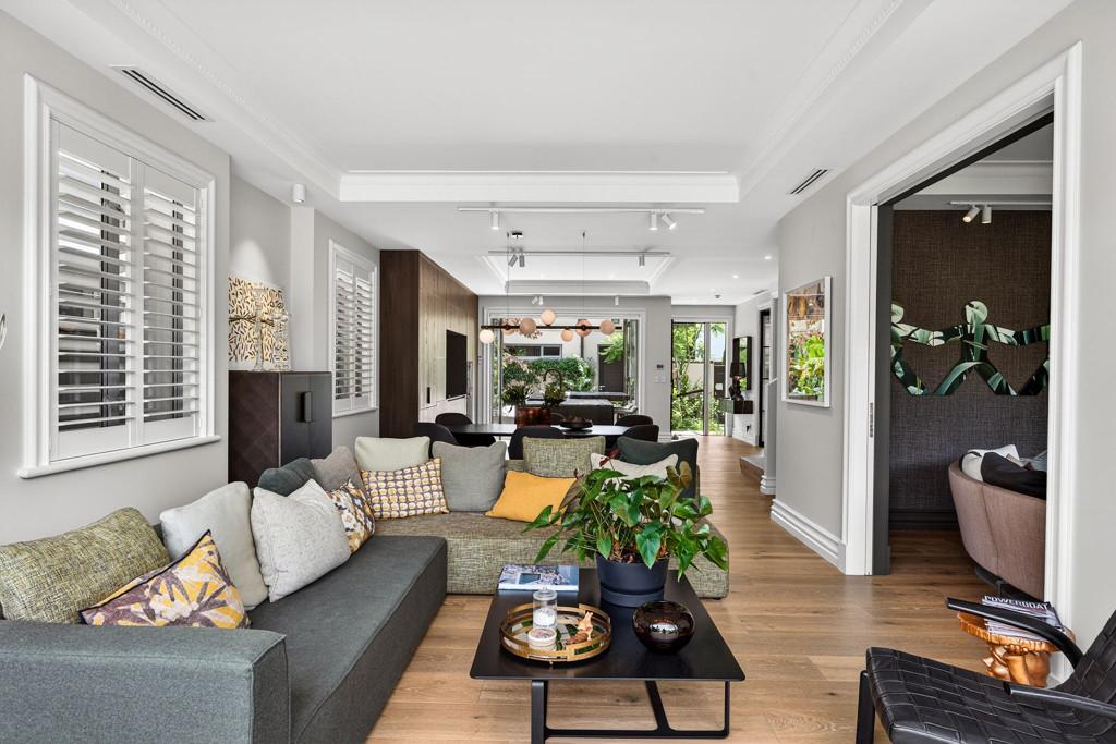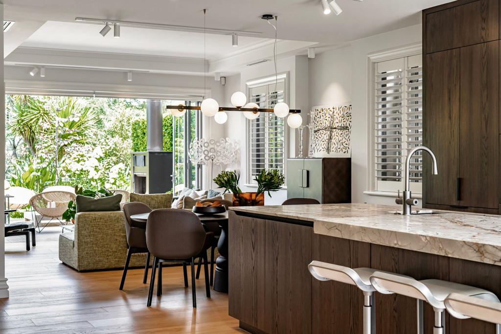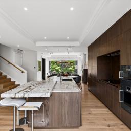 An entry path of imported designer natural stone leads to a lush courtyard, establishing an immediate sense of arrival. Inside, the heart of the home reveals a striking culinary centerpiece. The kitchen is a masterclass in functional luxury, featuring a full suite of Gaggenau appliances, including integrated refrigeration, induction cooktop, and dual ovens. Italian marble benchtops, oak-stained cabinetry, a Zenith 3-in-1 tap, and an integrated Liebherr drinks fridge complete a space equally suited to quiet mornings or elegant entertaining.