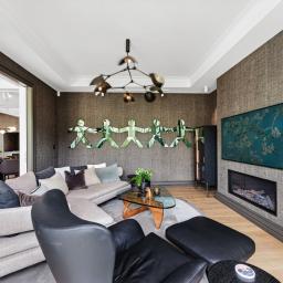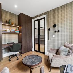 This level also includes a beautifully appointed work-from-home office, enclosed by custom steel pivot doors and finished with Borastapeter wallpaper and bespoke cabinetry. A chic powder room, separate laundry, and wine cellar complete the floor with understated sophistication.