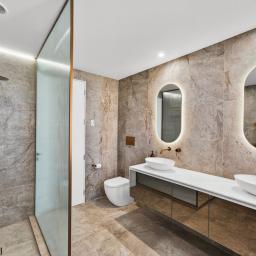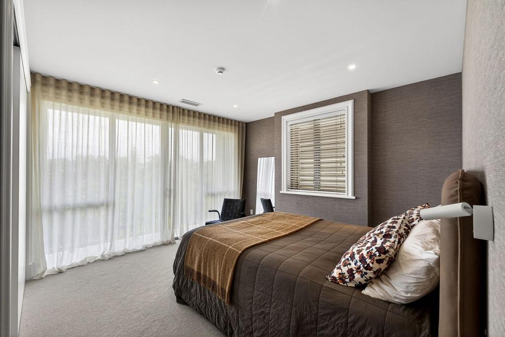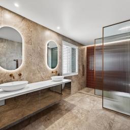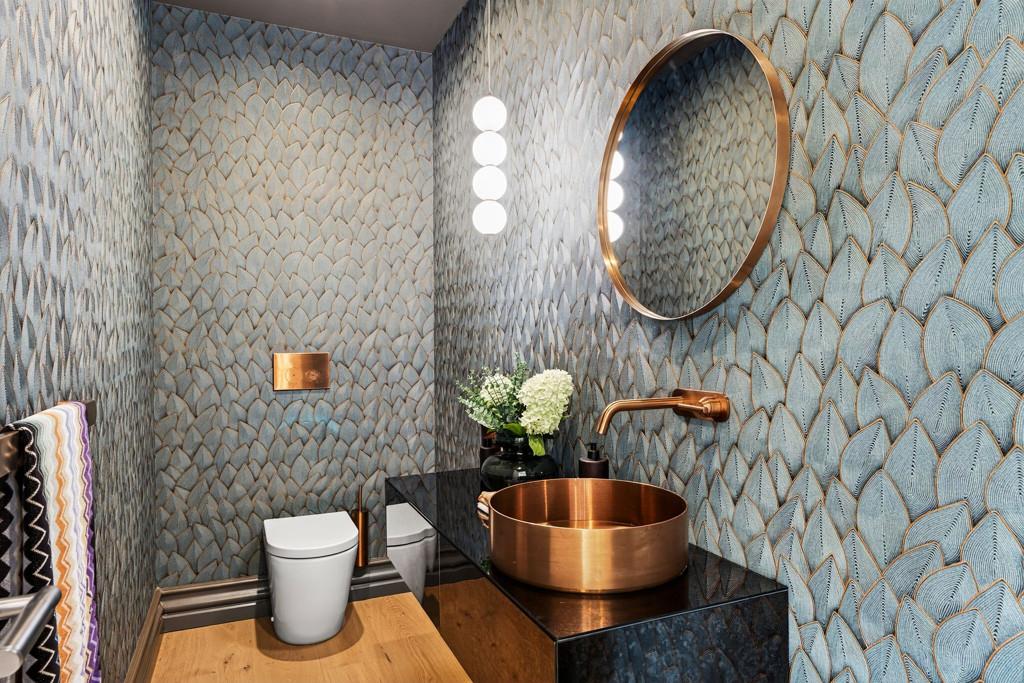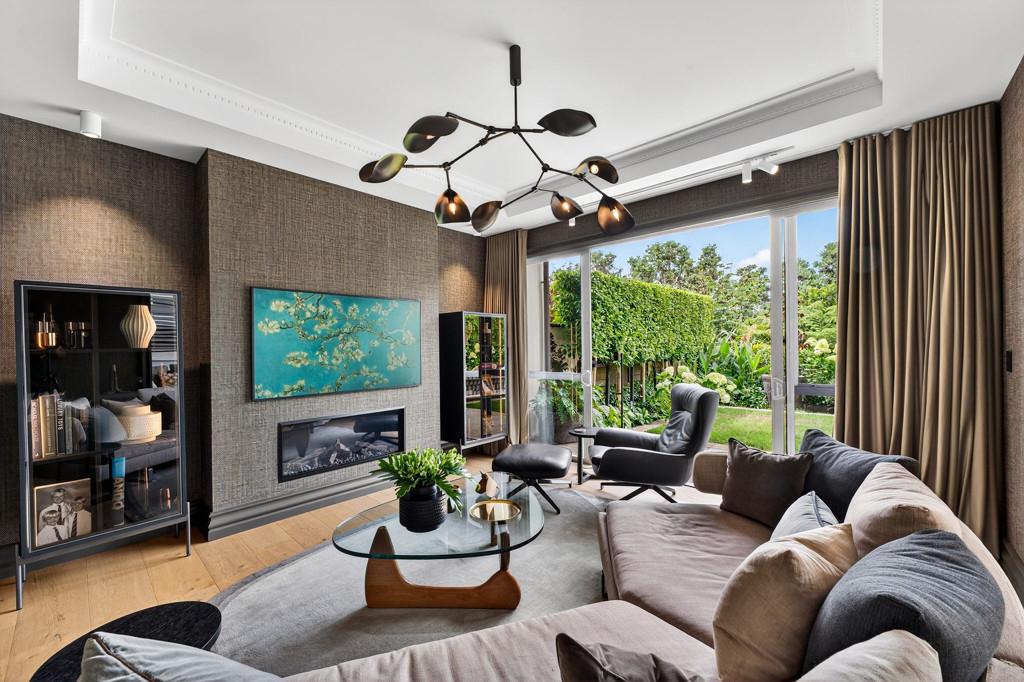 Upstairs, the master suite evokes the calm of a boutique hotel. Wrapped in Elitis wallpaper, the bedroom flows into an expansive walk-in wardrobe with bespoke cabinetry. The oversized ensuite features a custom vanity, brushed copper tapware, and Italian porcelain tiles. Two further generously proportioned bedrooms enjoy elevated park views and are serviced by a beautifully finished family bathroom with elegant copper detailing.