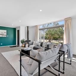 The light-filled living area enjoys an amazing connection to the outdoors, with bi-fold and French doors opening to the garden on two sides — perfect for relaxing or entertaining.