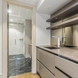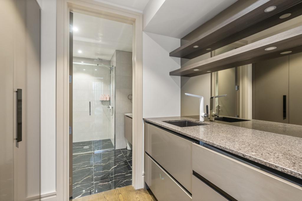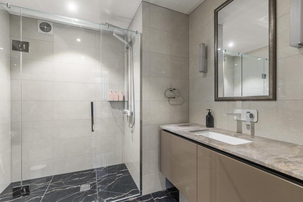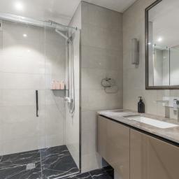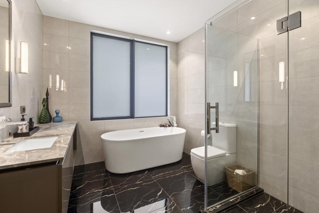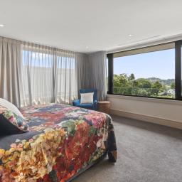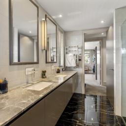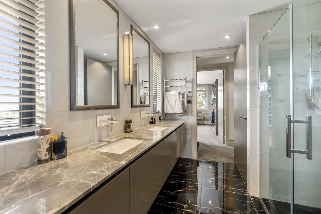 • The upper level is dedicated entirely to the primary suite. Private and serene, it features generous his-and-hers dressing rooms framed by harbour views, and a luxurious ensuite with underfloor heating, rain showers, refined porcelain finishes and timeless marble benchtops, a material language carried consistently throughout all four bathrooms.
