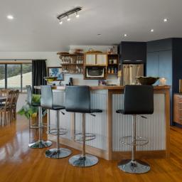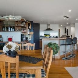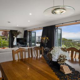 The heart of the home is the open-plan kitchen, dining, and living area, designed for modern living and easy entertaining. Bifold doors open out to a wrap-around deck, uninterrupted panoramic views provide a stunning backdrop for everyday life. A home office sits just off this space, offering practical flexibility for work-from-home or study.